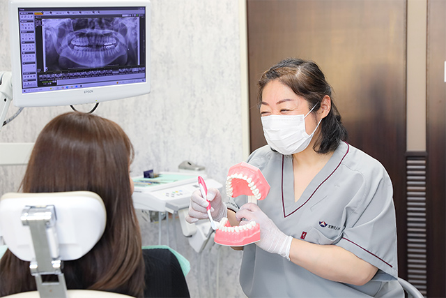 初診時にはじっくりお話を伺い、Dental XのCGやアニメーションを使ってわかりやすく説明します。治療計画書も印刷してお渡しし、内容を共有。高いリピート率を誇る信頼を礎に、安心して通える歯科医院を目指しています。